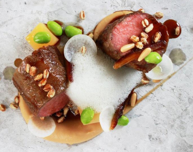 This is a dish that stimulates your senses - the beauty of the crystalline praline that sits above the bed of cheesecake, the gentle smell of lavender with each bite and chewy tapioca is contrasted with the soft cream cheese and sweet and pungent sous-vide strawberries.